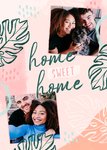 Front of card: New Home Photo Upload Card Illustration of leaves with photo frames on a pink abstract pattern background. Text reads: "Home sweet home".