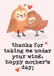 Front of card: Sweet Mother's Day Card Illustration of two owls hugging surrounded by love hearts. Text reads: "thanks for taking me under your wing. happy mothers day".