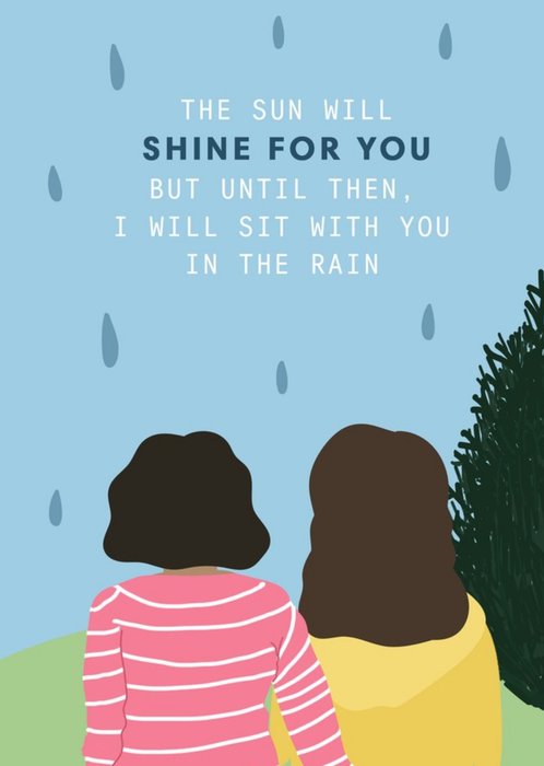 Front of Card Illustration of two people looking out over a green hill with rain drops falling around them Text reads:"The Sun Will Shine For You But Until Then, I Will Sit With You In The Rain"