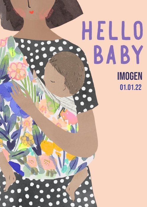 Illustration of a Mummy holding a new born baby in a baby sling. Contains Hello baby message and editable name and date of birth areas.