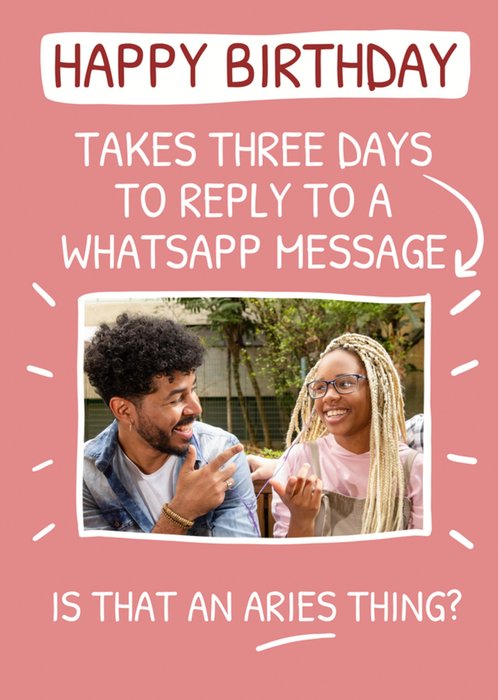 Front of card: Featuring white handwritten typography with a photo frame on a pink background. Text reads: "Happy birthday takes three days to reply to a WhatsApp message Is that an Aries thing?".