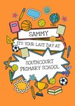 A vibrant and playful card with an orange background, decorated with colourful illustrated school-themed doodles including books, globes, footballs, rulers, notepads, pencils, and trophies. It features bold comic-style text areas and can be personalised with the pupil's name and school name. Perfect for marking a child’s last day at primary school.