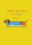 Front of card: Illustration of a sausage dog in blue jumper and red polka dot shorts on a yellow background. Text reads: "Happy birthday to a very silly sausage"