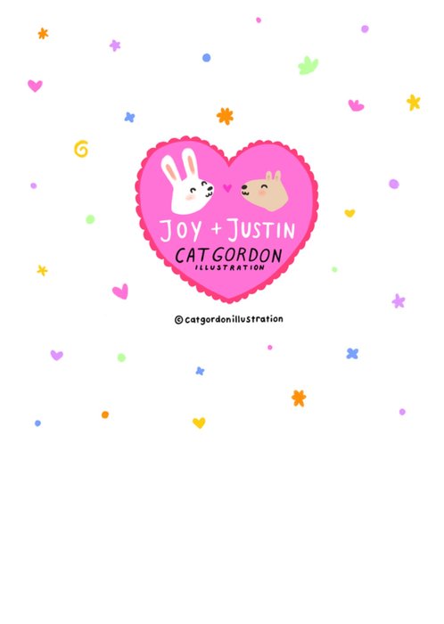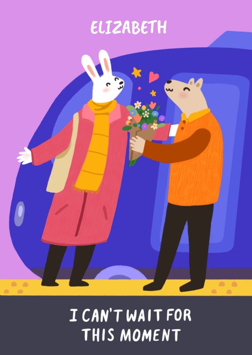 This sweet design features a sweet illustration of a rabbit and a bear meeting at a train station, with the bear offering a bouquet of flowers to the rabbit, and the personalised name at the top, accompanied by the message “I can’t wait for this moment” at the bottom, creating a romantic and heartfelt design.