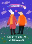 This sweet design features a charming illustration of two animal characters, a rabbit and a bear, holding hands under a starlit night sky with a rainbow banner displaying the name editable name and the message “You fill my life with wonder” below, creating a heartwarming and whimsical design.