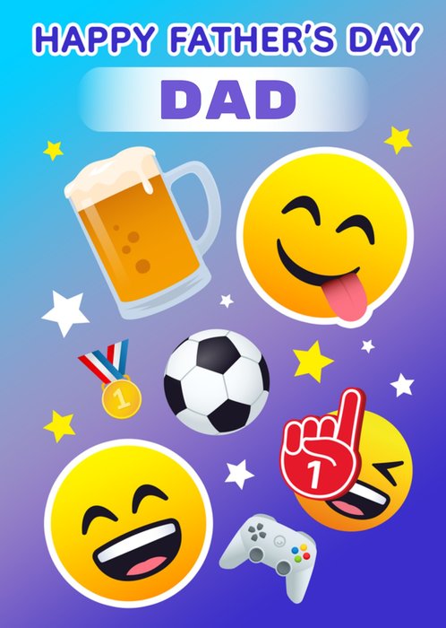 Front of card: Featuring a variety of emojis including; happy faces, beer glasses, a sports medal, football, foam finger and a gaming controller, with stars on a gradient background.