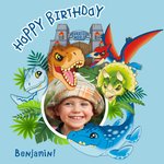Card features cute illustrations of a T-Rex, Pteranodon, Triceratops, Mosasaurus and Raptor peeking out behind a circular photo upload in the centre of the card. Blue bakcground.