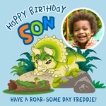 Front of card: Jurassic Park Cute Cartoon Triceratops Son Photo Upload Birthday Card
