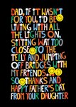"Dad, if it wasn’t for you, I’d be living with all the lights on, sitting way too close to the telly and jumping off bridges with my friends. So thanks and happy Father’s Day from your daughter".