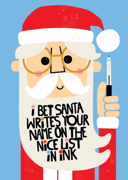 Featuring an illustration of Santa holding a pen. The text is placed in Santa's beard.