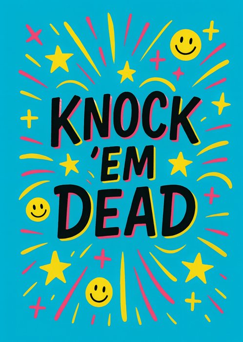 A bold, colourful design featuring hand-lettered typography with stars, smiley faces, and firework-style bursts on a blue background.