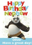 Front of card: Kung Fu Panda Nephew Birthday Card Features Po in a Kung Fu pose surounded by green splattered paint pattern. Text reads: "Happy Birthday Nephew. Oliver Have A Great Day!". Name is customisable.