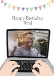 Front of card: Laptop Photo Upload Birthday Card Illustration of a laptop with a photo frame. Text reads: "Happy Birthday Tom!". All text can be personalised!
