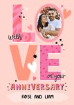 Front of card: On Your Anniversary Photo Upload Card Large colourful typography with hearts and an oval photo frame. Text reads: "With love on your anniversary Rose and Liam". 'Rose and Liam' can be personalised!