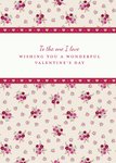 This classic design features an elegant floral patterned background with heart border strips and centred romantic message, on a cream background.