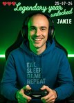Featuring a smiling gamer with a face swap photo upload, wearing headphones and holding a game controller with pixel hearts and neon-style lettering on a glowing green background.