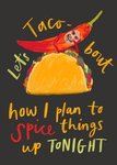 This playful greeting card features a taco and a chilli pepper illustration with hand-drawn lettering that reads, “Let’s Taco-bout how I plan to spice things up tonight,” set against a dark background. There is a circular photo upload area positioned on the chilli pepper’s “face” near the top of the design.