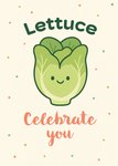 Featuring a cute illustrated lettuce with a smiling face in the centre on a greeting card, surrounded by small confetti dots on a cream background.