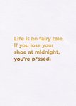 Front of card: Featuring gold typography on a white textured background. Text reads: "Life is no fairy tale, if you lose your shoe at midnight you're pissed.".