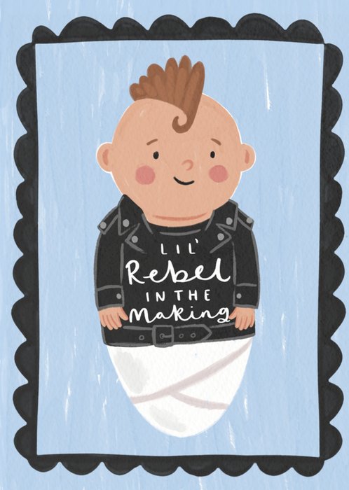 Featuring an illustrated baby with a brown mohawk hairstyle, wearing a black leather-style jacket and belt over a black top with white handwritten lettering, wrapped in a white swaddle, all framed by a bold scalloped black border on a pale blue background.