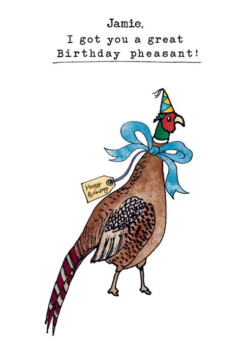 Front of Card: Illustration of a Pheasant with 70 and text. Text reads: "Happy Birthday, Grandad James. 70 Here's your Birthday Pheasant". Editable text: "Grandad, James and 70".