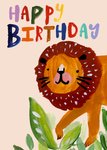 Featuring a bold and colourful hand-painted illustration of a lion walking through the jungle and wildlife, with colourful hand-painted typography at the top of the card, all on a beige background.