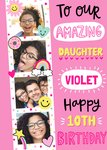 A cute and delightful Birthday card featuring three photo upload areas in a photo strip with polka dots in pastel colours, that is embellished with cheerful illustrations like a sunflower, cloud, donut, rainbow, star, and smiley faces. The card conveys heartfelt birthday wishes with bold, colourful text, the text is a mixer of different handwritten style fonts. This card encapsulates the essence of a joyful birthday celebration, filled with love and cheerful imagery.