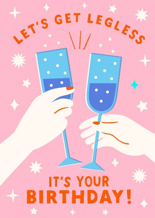 Front of Card: Illustration of two champagne glasses on a pink patterned background with orange typography. Text reads: "Let's Get Legless It's Your Birthday"