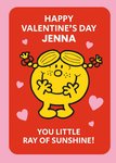 Little Miss Happy Valentines Day You Little Ray of Sunshine Personalised Card. Front of Card:Illustration of a Little Miss character in the center of the card, on a red and pink background. Surounded by large pink and small love hearts. White text is above and below the illustration. Text reads: "Happy Valentines Day Jenna You Little Ray of Sunshinel". Jenna can be prsonalised. Rear of card: Mr Men and Little Miss logo.