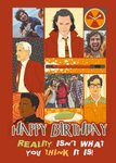 Front of card: Featuring illustrations in comic book format of Loki, Mobius M. Mobius, Hunter B-15 and Ouroboros with three photo frames. Text reads: "Happy birthday reality isn't what you think it is!".