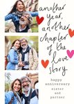 “Another year, another chapter of the love story, happy anniversary sister and partner”. 'happy anniversary sister and partner' can be personalised!