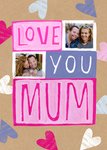 Front of card: Featuring vibrant hand drawn typography with two photo frames and vibrant love hearts on brown textured paper. Text reads: