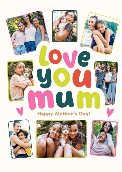 A heartfelt photo upload Mother’s Day card featuring multiple family photos surrounding the words “Love You Mum” in playful multicoloured typography. Includes a warm “Happy Mother’s Day!” message.