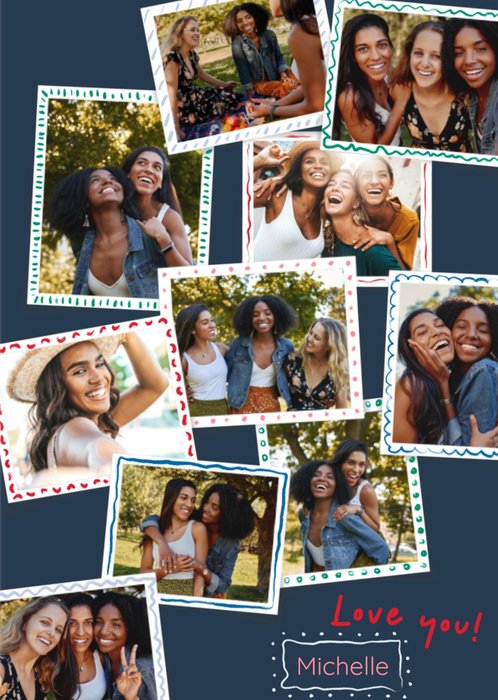 Featuring a collage of 10 photo frames with colourful doodle borders & text at the bottom of the card, all on a blue coloured background.