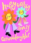 Front of card: Featuring a bright & bold hand-painted 70's illustration of flowers wearing bell bottoms with colourful hand-written typography above and below, all on a purple background.