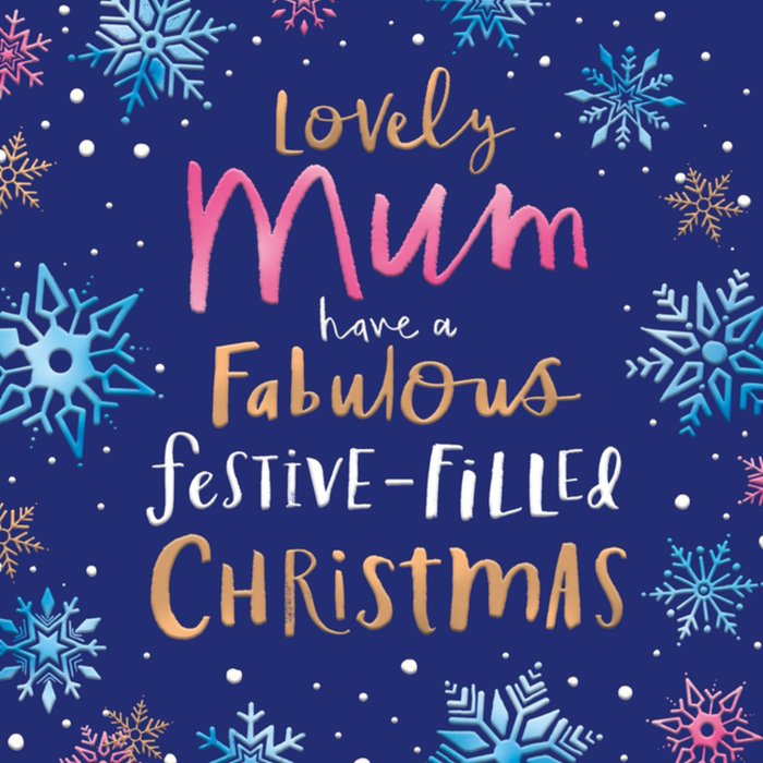 Featuring a hand-lettered festive message for Mum with pink and gold accents, surrounded by illustrated snowflakes on a dark blue background.