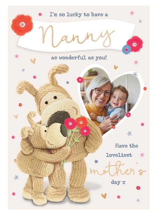 A warm and elegant Mother’s Day card for a nanny, featuring a textured cream background with hand-drawn illustrations of food, flowers, and wine. A circular photo upload area is at the centre, framed with delicate gold accents.