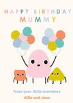 Front of Card: Cute illustration of Mummy monster and two little monsters and balloons. With colourful text above and below. Text reads: "Happy Birthday Mummy from your little monsters Allie and Jess." Editable name.