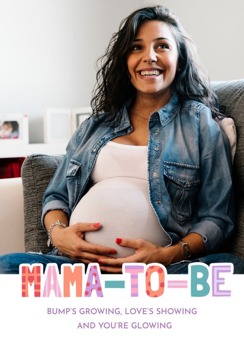 Featuring a large photo upload in the top section of the card. With bold multicoloured Mama-To-Be typography below. Underneath this is personalised text on a white background.