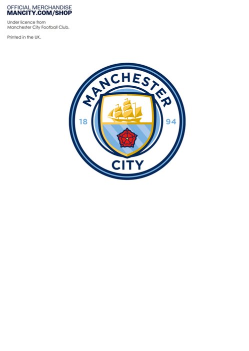 Greeting card featuring the back of a light blue Manchester City football shirt with a white collar, showing a custom name and number, set against a dark blue background with the club crest.