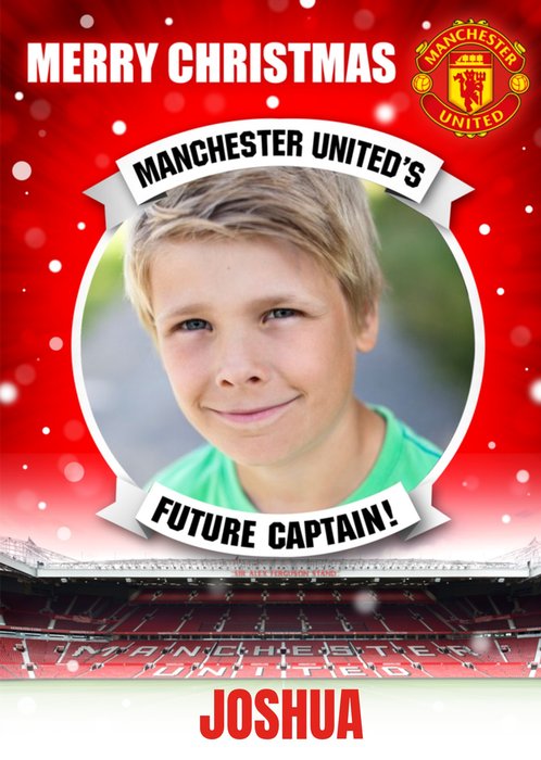 Front of card: Large circle photo upload area with 'Manchester United's Future Captain!' in banners around it. At the bottom of the card text reads 'Joshua'. This can be personalised!