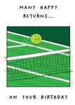 Front of card: Illustration of a smiling tennis ball flying over a tennis net on a green court, with playful motion lines suggesting a return shot.