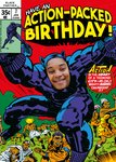 Front of card: Featuring a retro illustration of Black Panther with a face upload frame. Text reads: "Have an action packed birthday" and "Action in the heart of a teeming city--as only mighty Marvel can present it!".