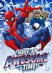 This dynamic Spider-Man Christmas greeting card design features Spider-Man swinging through a snowy, nighttime cityscape with web patterns and snowflakes, paired with the bold message “Have an Awesome Time!” in icy, eye-catching text, creating an action-packed and festive feel.