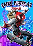 Cartoon of Miles Morales from Into The Spiderverse jumping in the air on a skateboard. In the background, there is a subway train, graffiti and neon web & arrow with paint splatters.