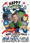 Featuring cartoon illustrations of Hulk, Iron Man, Thor, Captain America, and Black Panther surrounding a central photo upload area with bold playful typography & comic-style stars, lightning bolts, and doodles, all on a white background.