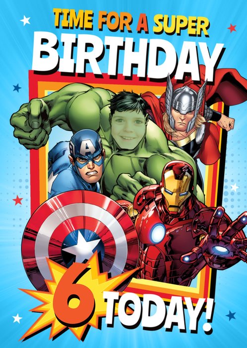 Front of card: Featuring an illustration of Hulk with a face upload, Thor, Iron Man and Captain America. Text reads: "Time for a super birthday 6 today!". '6' can be personalised!