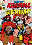 Front of card: Featuring a retro illustration of Black Widow, Falcon, Thor and Iron Man with face upload frames. Text reads: "Time to assemble for your birthday!".