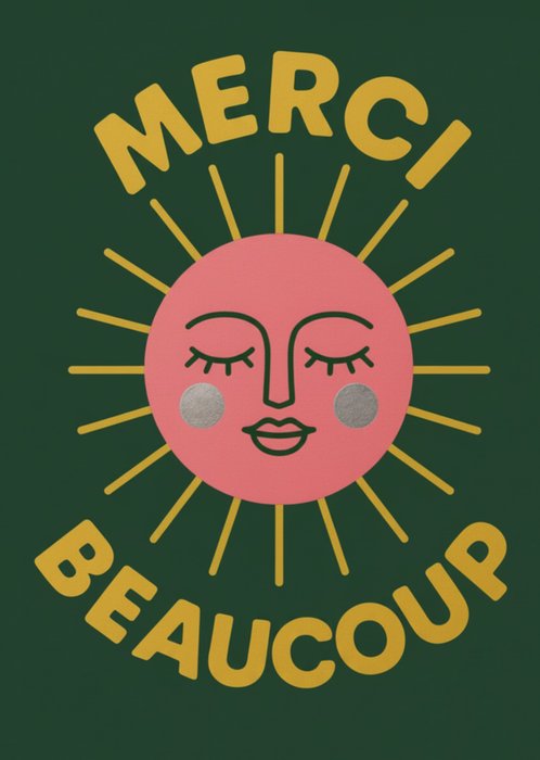 A modern design featuring a central illustration of a pink sun with silver foil cheeks framed by yellow typography on a dark green background.