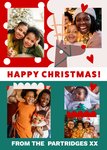 A bold and cheerful Christmas card featuring four photo upload areas and an illustrated reindeer.